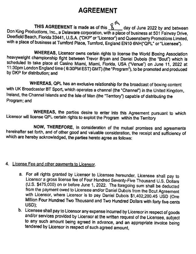 Don King: “If all the above statements from the pretender to be Frank Warren are true… then how can the pretender Frank Warren, direct me to deduct $475,000 from Daniel Dubois’s purse to purchase the TV broadcast rights for the UK for BT Sports TV??? For Frank Warren’s (Queensberry Promotion) I have never talked to Daniel Dubois, and all of the business that I have conducted for Daniel Dubois has been conducted through his promoter Frank Warren (Queensberry Promotions). Enclosed are the paragraphs:
