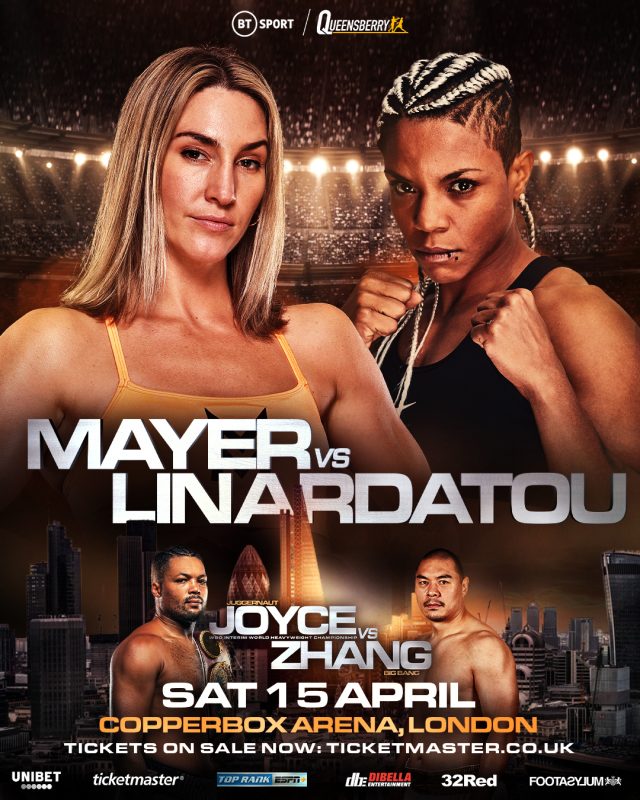 Tickets for Mayer- Linardatou – co-feature to the showdown between Joyce and Zhang on Saturday, 15 April at the Copper Box Arena, London – are on sale now available from ticketmaster.co.uk.