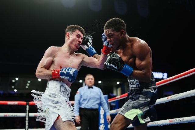 Opening up the DAZN broadcast with eight-rounds of super middleweight action, Reading, Pennsylvania’s David “Dynamite” Stevens (13-0, 9 KOs) went the distance against Marco Periban (26-7-1, 17 KOs) of Mexico City. The two went toe-to-toe, Stevens managing to box from the outside well. Stevens’ gloves hit the canvas in the third round due to a combined punch/ headbutt that sent him to the mat. The judges scored the fight 78-73, 77-74, and 78-73 unanimously for Stevens.
