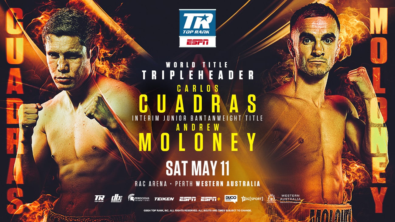 “I look forward to the challenge of fighting Andrew Moloney in Australia, and I am coming to prove I am still a force at 115 pounds,” Cuadras said. “There are many great champions in my division, but I can’t overlook Moloney, a hungry fighter who will be encouraged by the Australian fans.”